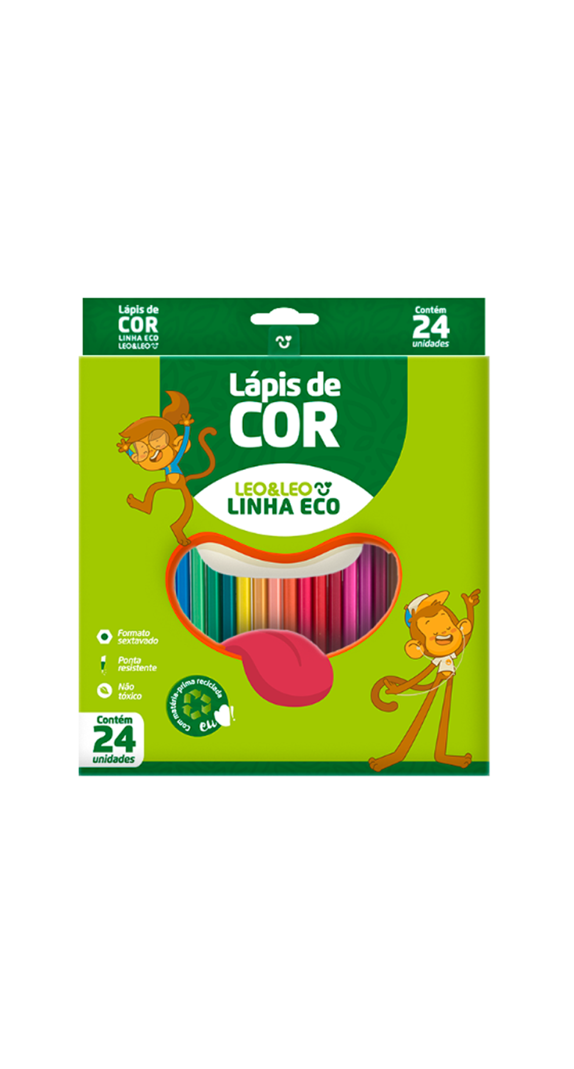 O Lápis de Cores Leo&Leo é seguro e resistente, próprio para a fase escolar. A caixa possui 24 cores, mina macia e resistente, corpo sextavado que não escorrega na mesa. Produto seguro e certificado pelo Inmetro.